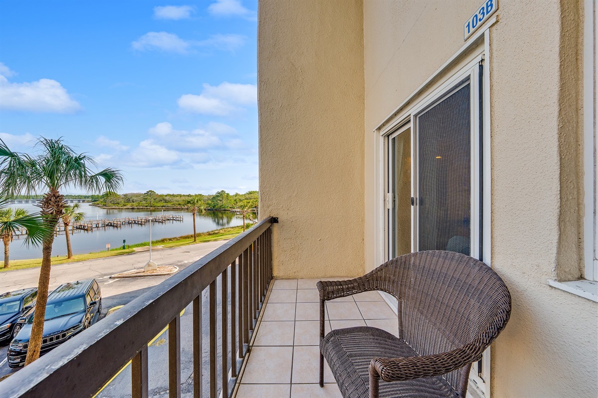 Lake-view balcony right off the living area—perfect for morning light and evening calm