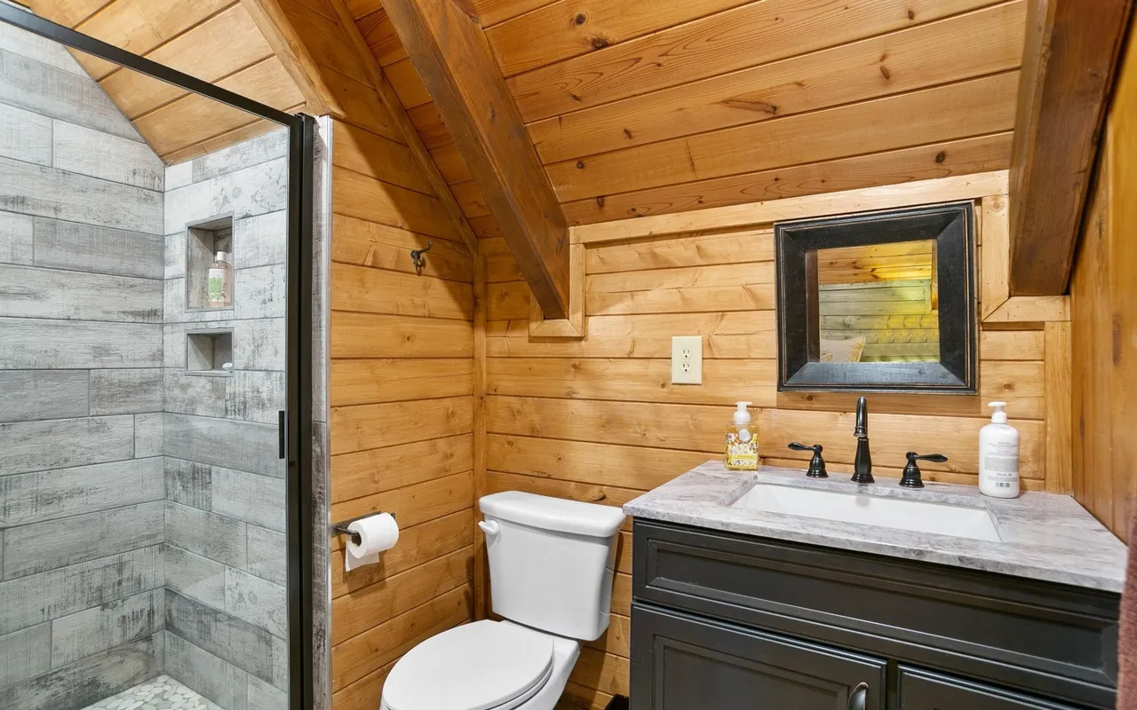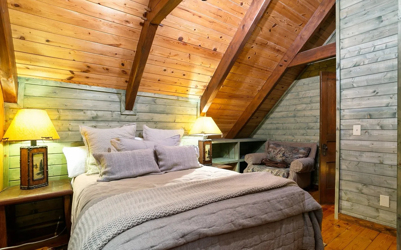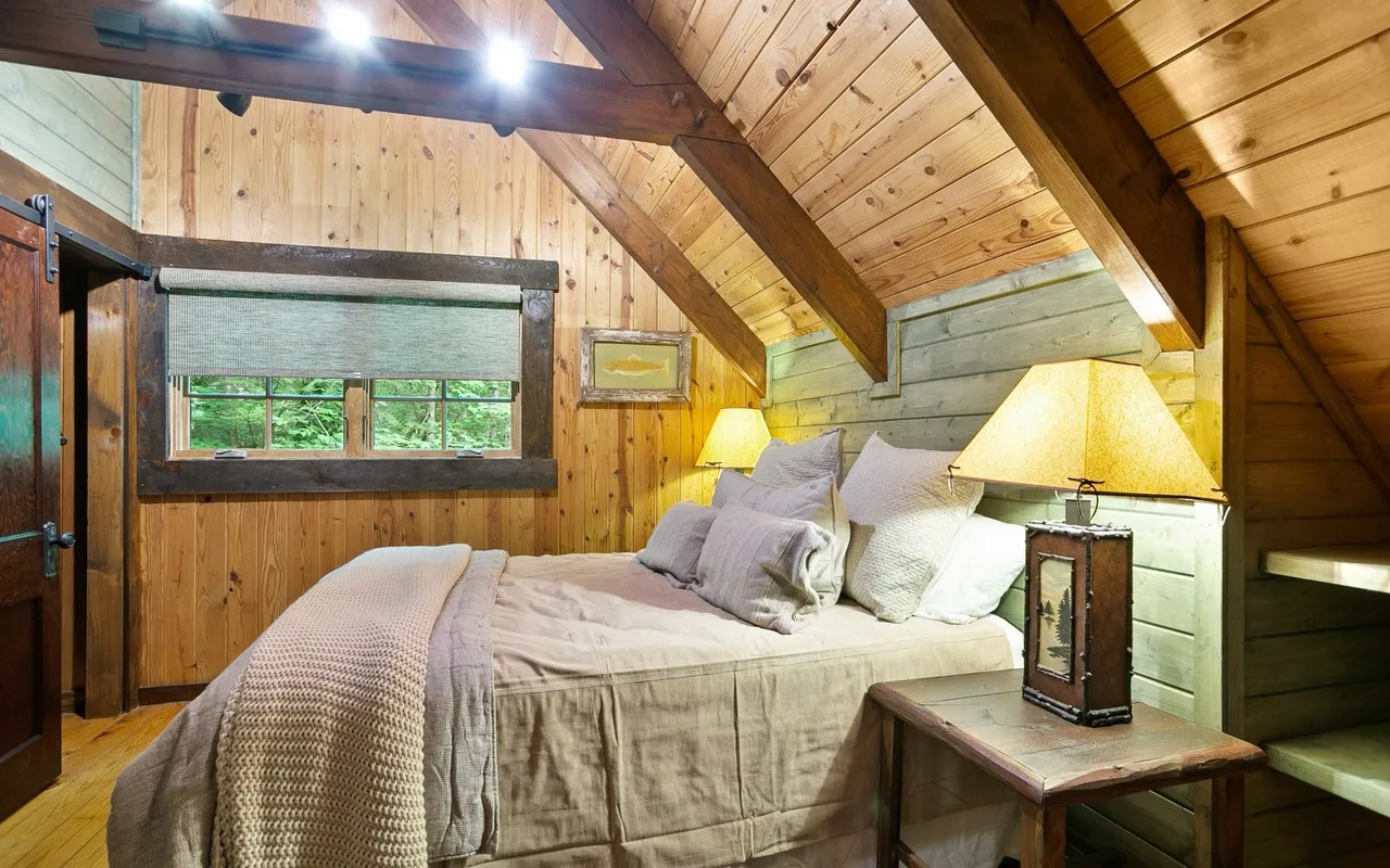 • Bedrooms & Baths: The cabin features two beautifully appointed bedrooms and two full, well-designed bathrooms. The master suite is conveniently located on the main level for ease of access, while the upper level provides a cozy second bedroom with rustic design touches.