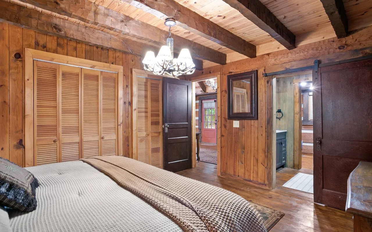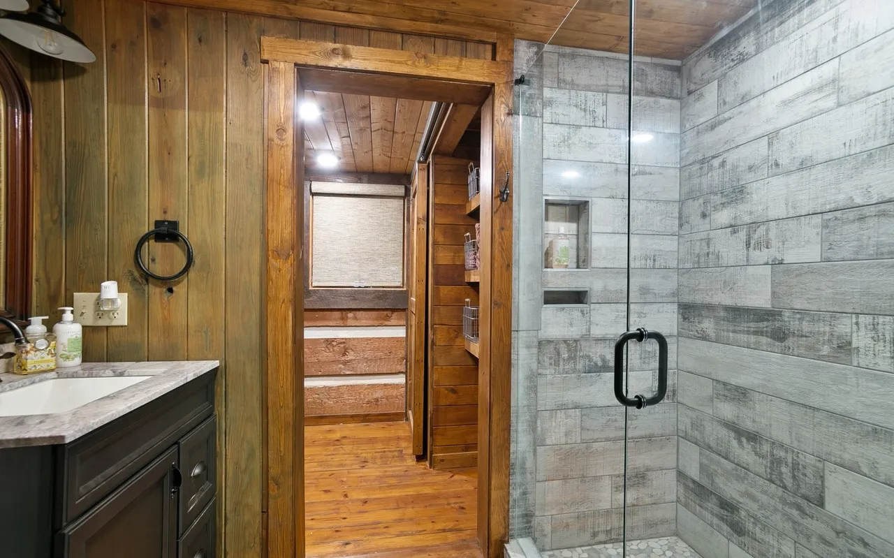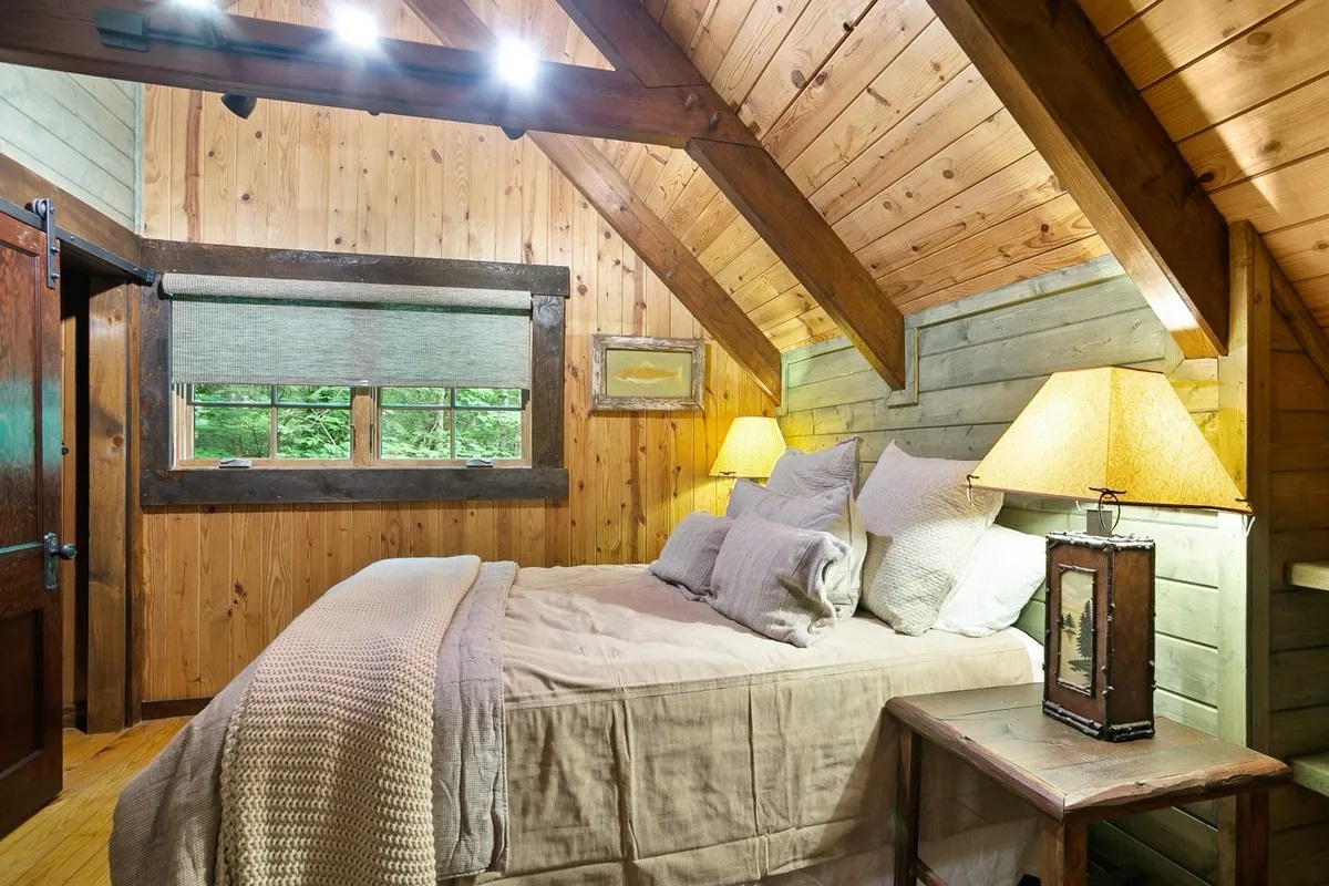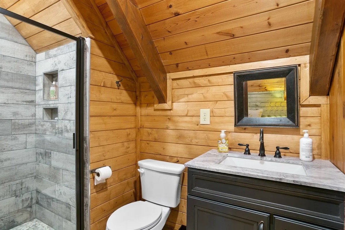 • Bedrooms & Baths: The cabin features two beautifully appointed bedrooms and two full, well-designed bathrooms. The master suite is conveniently located on the main level for ease of access, while the upper level provides a cozy second bedroom with rustic design touches.